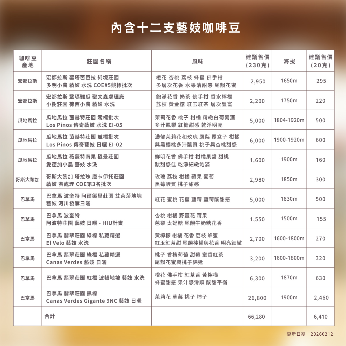Comes with 12 tubes of Geisha coffee beans (20g each)